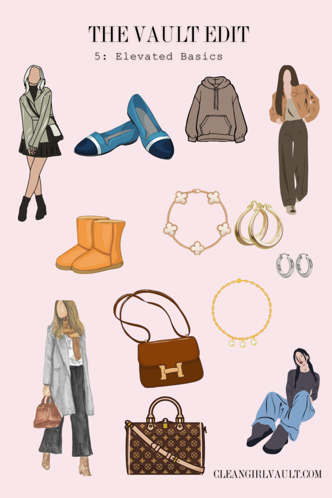 The clean-girl aesthetic starts with simplicity, not excess. Think timeless pieces that make you feel put together without trying — crisp tees, soft knits, neutral sets, gold hoops, and sleek hair clips. Each item should feel intentional and high-quality, even if it’s basic.